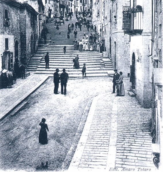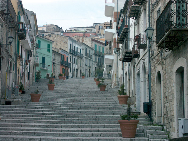 E’ necessaria a questo punto una segnalazione. Esiste una fontana gemella a Casalanguida (Ch). E’ stata progettata dalla stessa persona? Un interrogativo per chi, nelle due località, volesse approfondire l’argomento. Il cippo e la fontana sono la porta attraverso la quale si entra in una dimensione dove il tempo sembra essersi fermato, quasi a volersi specchiare su se stesso. L’immagine riflessa,però, è quella di una magnifica scalinata a tre corsie: una centrale,molto ampia, di largo respiro, e due laterali a mò di graziose ‘vallette’. Tutte e tre rigorosamente in splendida pietra. Subito si presenta la tentazione di salirla. Scalino dopo scalino arriviamo davanti alla chiesa di S.Nicola a cui è intitolata la scalinata. Davanti all’ingresso si può ammirare una bella statua marmorea del Cuore Immacolato di Maria. A quota 150 scalini ecco il Largo di Porta Maggiore. La vista retrospettiva spazia sulla Trivento moderna e si perde sulla montagna incombente. A quota 175 una poderosa costruzione le ‘sbarra la strada’ costringendola a diramarsi e dare luogo ad una via Roma…fatta di scale. A quota 234 scalini eccoci in una grande piazza dove ci sono la cattedrale, il Campanile, la chiesa della SS Trinità e la Curia. Trivento, infatti è anche una delle sedi vescovili più antiche. La chiesa madre di tutte le chiese è la Cattedrale. Fu eretta su una preesistente basilica dedicata a S.Casto, primo vescovo della Diocesi. Vari sono stati, nel corso dei secoli, i rifacimenti interni ed esterni che, a partire dal 1076 per arrivare al 1984, hanno interessato il monumento. La Cripta, il monumento più insigne della città che si trova a qualche metro di profondità, sotto il transetto e il presbiterio della Cattedrale, segna il passaggio dal Tempio pagano, dedicato a Diana, al primo Cristianesimo. Un portale con arco a ogiva, a sinistra della Cattedrale, introduce nel giardino dell’Episcopio dove si respira …la storia. Lasciando la piazza, e percorrendo una stretta via, si passa davanti ad un palazzo baronale che ricorda, nell’insieme, il complesso delle Torri montanare a Lanciano. Pochi passi e ci si trova in quel punto che, dalla Fondovalle, ci sembrava “tre passi sopra il cielo”. Vista a 360°, orizzonti superbi dai profili frastagliati,dirimpettai illustri (Schiavi d’Abruzzo, Vastogirardi, Pietrabbondante: luoghi di adunanze e di culto di tutta la nazione sannita, cosi come testimoniano i templi italici presenti nei loro territori).