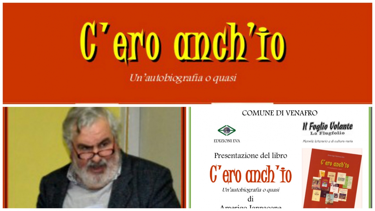 Sarà presentato a Venafro, Biblioteca Comunale, sabato 22, alle ore 18, il nuovo libro dello scrittore venafrano Amerigo Iannacone “C’ero anch’io - Un’autobiografia o quasi” (Edizioni Eva, Venafro 2017, pp. 200, € 15,00, ISBN 978-88-97930-94-5).. Ne parleranno Vincenzina Scarabeo (Dirigente Scolastica), Aldo Cervo (Scrittore, Prefatore del libro), Giuseppe Napolitano (Poeta, Critico letterario), Chiara Franchitti (Dottoressa in Lettere Classiche), Antonio Vanni (Poeta). Seguirà l’intervento dell’Autore.