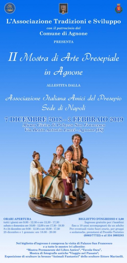 Dopo il successo della prima edizione del 2017, torna la mostra allestita dall'Associazione Italiana amici del presepe di Napoli e organizzata dall' Associazione agnonese, Tradizioni e sviluppo. Saranno 29 i preziosi pezzi esposti in teche poggiate su tavoli in legno frutto della lavorazione artigianale locale. I pezzi presepiali in esposizione sono in terra cotta, tutti provenienti da Napoli e plasmati da maestri scultori