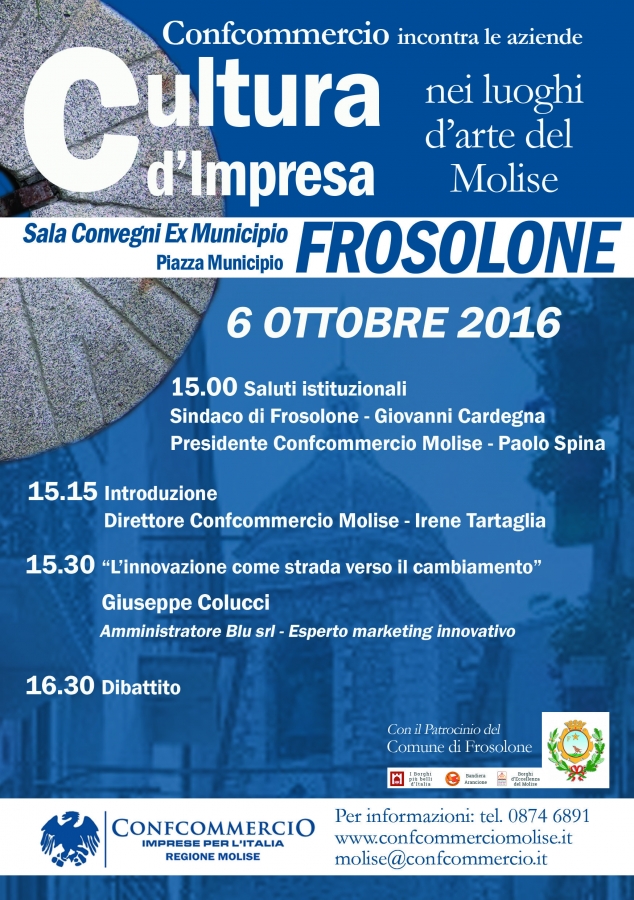 Con inizio alle ore 15,00 nella Sala Convegni, situata nell’ex municipio, l’incontro verrà inaugurato dai saluti istituzionali del sindaco, Giovanni Cardegna e da quelli del presidente di Confcommercio Molise, Paolo Spina, seguiti dall’introduzione presentata del direttore Confcommercio Molise, Irene Tartaglia.