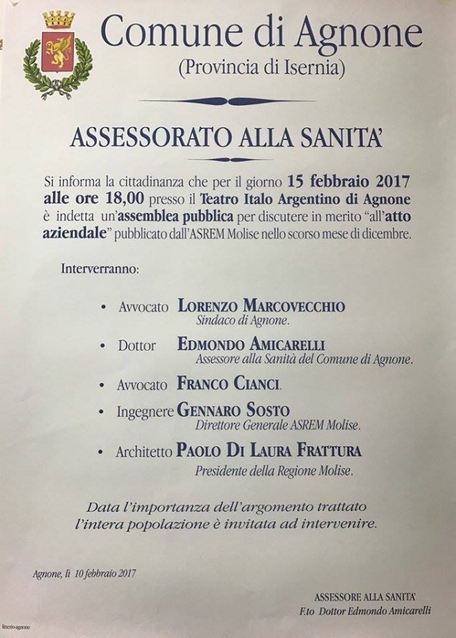 Il 15 Febbraio alle ore 18, l'assessorato alla Sanità del Comune di Agnone , ha indetto una assemblea pubblica avente all'ordine del giorno, l'Atto Aziendale della Regione Molise. L'atto aziendale fotografa la sanità molisana nelle sue molteplici articolazioni di servizi e funzioni. L'ospedale di Agnone S.F. Caracciolo è ivi ricompreso: Come si articolerà , quali sono i servizi previsti, quale e quanto personale previsto, sarà l'oggetto interessante della Assemblea Pubblica, oggetto.che sta a cuore a tutta la popolazione dell'Alto Molise. Ad informare e dare le risposte ai cittadini,ai molteplici interrogativi sul SF. Caracciolo: Il Presidente della Regione Molise Frattura, il Direttore generale Asrem Sosto,Il Sindaco di Agnone Lorenzo Marcovecchio, l'Assessore alla Sanità Comune di Agnone Edmondo Amicarelli, Avv. Franco Cianci