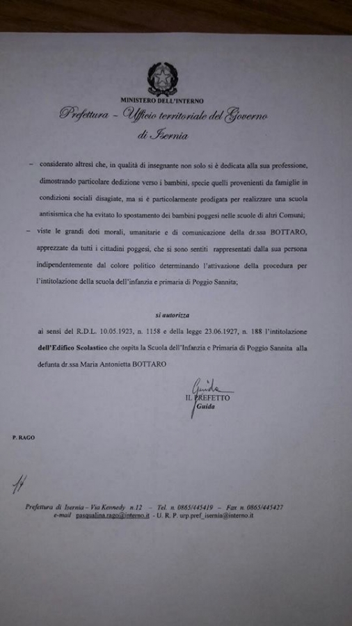 La prefettura di Isernia ha autorizzato l'intitolazione della scuola d'infanzia e primaria di Poggio Sannita alla compianta dott Maria Antonietta Bottaro, insegnante e Sindaco,, deceduta precocemente e tragicamente in un incidente d'auto . E' con grande commozione che gli abitanti del piccolo centro molisano apprendono la notizia