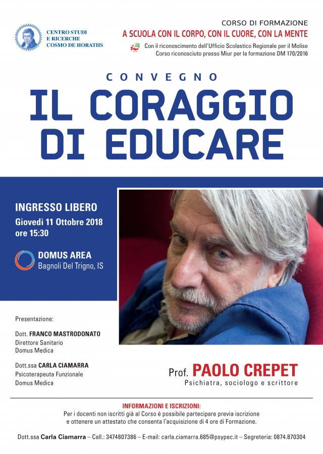 Un successo di iscrizioni, oltre 200 insegnanti di ogni ordine e grado, per l'incontro con il prof. Paolo Crepet, psichiatra, sociologo, scrittore e relatore d’eccezione del convegno in programma giovedì 11 ottobre alle ore 15:30 alla Domus Area di Bagnoli del Trigno come apertura ufficiale del corso di formazione “A SCUOLA CON IL CUORE CON IL CORPO CON LA MENTE” riconosciuto dal MIUR per docenti di ogni ordine e grado e studenti universitari.