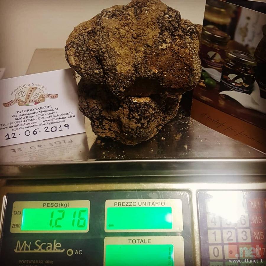 E' stato ritrovato questa mattina nei territori della provincia di Campobasso un tartufo nero da record. Lo hanno fatto i dipendenti dell'azienda tartuficola "Di Iorio tartufi" di Busso coordinata da Vincenzo Di Iorio. Lo scorzone estivo pesa 1,216 kili e considerando il clima sfavorevole e gli ultimi comportamenti da parte di chi cava i tartufi si può definire un ritrovamento record.