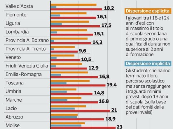Letti uno di seguito all’altro sono i numeri di una disfatta: 21 per cento nel Lazio, un ragazzo su cinque; 23 per cento in Molise, quasi uno su quattro; 25,7 in Basilicata e 26,8 in Puglia. E poi: Campania (31,9), Calabria (33,1), Sicilia (37) e Sardegna (37,4). Sono tantissimi e sono i ragazzi e le ragazze che il nuovo studio dell’Invalsi sulla «dispersione scolastica implicita», firmato da Roberto Ricci, considera perduti dal nostro sistema scolastico. Quelli che non finiscono le scuole superiori più quelli che arrivano sì al diploma finale ma con un livello di conoscenze così basso che quel pezzo di carta non gli servirà a nulla.