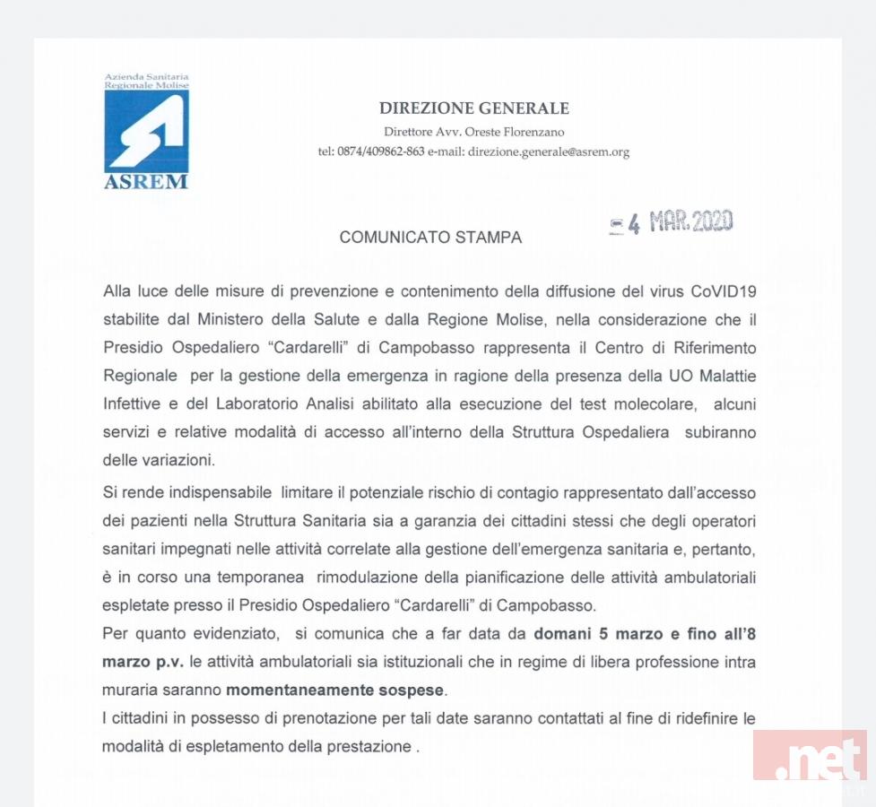 Alla luce delle misure di prevenzione e contenimento della diffusione del Covid 19 stabilite dal Ministero della salute, nella considerazione che il Presidio ospedaliero Cardarelli di Campobasso rappresenta il centro di riferimento regionale di emergenza, per evitare il rischio contagio si comunica che da domani 5 marzo fino all' 8 marzo le attività ambulatoriali sia istituzionali che in ragime di libera professione intramuraria saranno momentaneamente sospese.