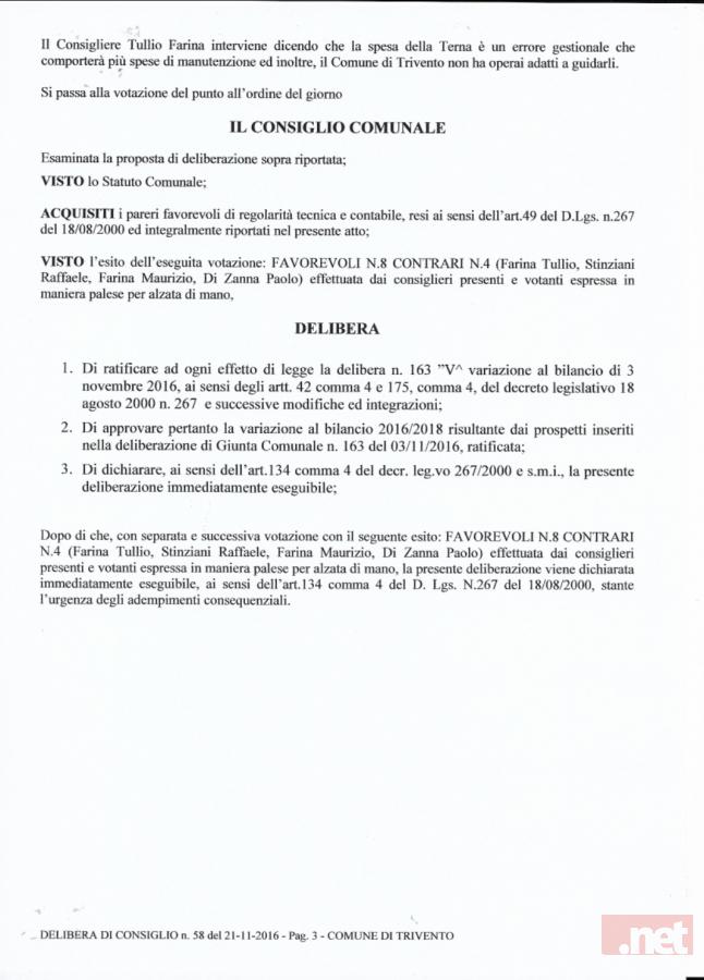 Nel 2016 con atto giuntale n. 169 del 16 novembre l’illuminata e lungimirante, si fa per dire, giunta del Comune di Trivento che ha  preceduto  l’attuale esecutivo, deliberò l’acquisto di una terna  già usata  da utilizzare per  i lavori stradali. Da quella data a tutt’oggi  quel mezzo tra il suo acquisto e la continua manutenzione è costato quasi o oltre  30.000,00 euro, tant’è che nel 2018 con determinazione n. 739  R.G del 30/11/2018  si dovette procedere all’acquisto di un motore. Ricordo che proprio nel momento del suo acquisto, ritenendo improvvida l’iniziativa, perché già nel passato il Comune aveva acquistato un mezzo gommato la cui gestione si era rivelata fallimentare per cui si era stati costretti a venderlo, presentai una interrogazione al sindaco nella quale facevo presente la poco convenienza della iniziativa, considerata l’esperienza precedente, chiedendo  quando,  come e da chi sarebbe stata utilizzata la terna acquistata.  In modo particolare ricordo che nella delibera consiliare n 58 del 21/11/2016 feci mettere al verbale la seguente dichiarazione “Il consigliere Tullio  Farina interviene dicendo che la spesa della terna è un errore gestionale che comporterà più spese di manutenzione ed inoltre il Comune di Trivento non ha operai adatti a guidarla “  Naturalmente furono parole di” vox clamantis in deserto.”  Con la solita saccenteria, figlia dell’incompetenza, del pressapochismo e dell’inesperienza mi si rispose che l’operazione era conveniente e che avrebbe fatto risparmiare soldi al Comune, non tenendo però presente che nella pianta organica del dell’Ente non c’erano operai specializzati per tale mezzo Ed infatti in più occasioni si è dovuto ricorrere anche  all’utilizzo di operai esterni.