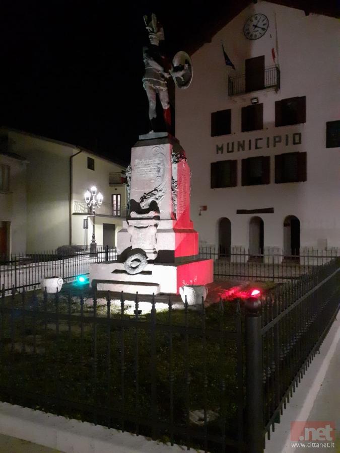 A Pietrabbondante (IS) la statua che troneggia nella piazza principale del paese si illumina con i colori dell’Italia come segno di unione e speranza per tutta la popolazione italiana, unita nell’emergenza del coronavirus.