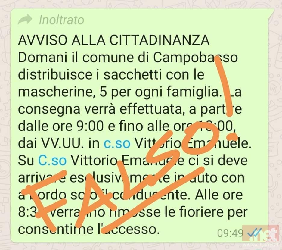 L’Amministrazione Comunale di Campobasso, a seguito di alcune segnalazioni, chiarisce che il messaggio che sta circolando tramite chat su Whatsapp e che informa la cittadinanza di una presunta distribuzione di “sacchetti con le mascherine” da parte del Comune su Corso Vittorio Emanuele, è chiaramente un falso.