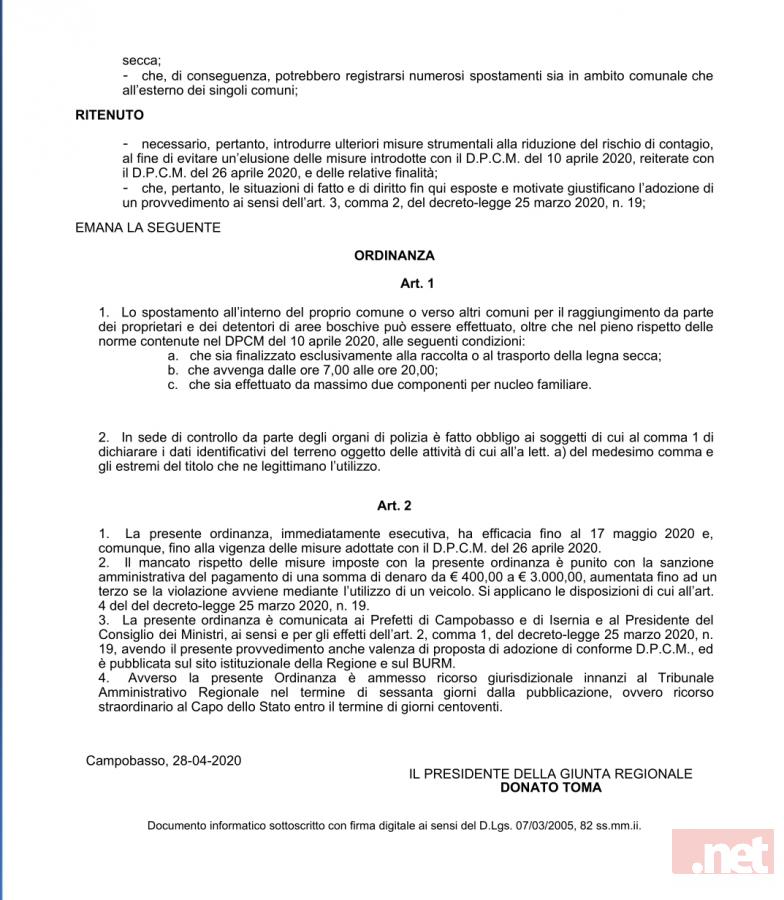 Nuovo allentamento delle misure restrittive da parte del presidente della Regione Donato Toma.