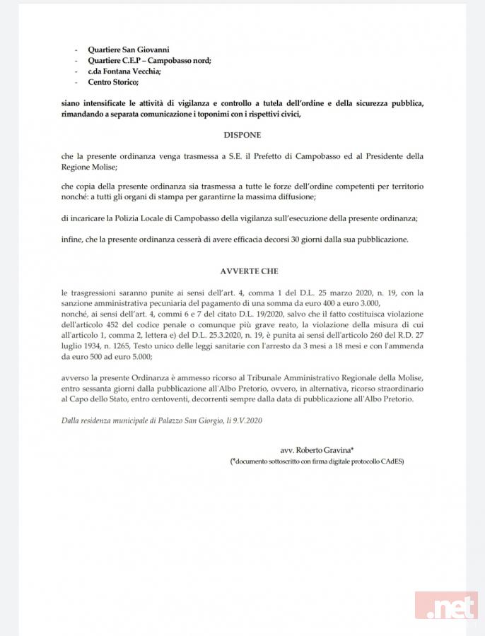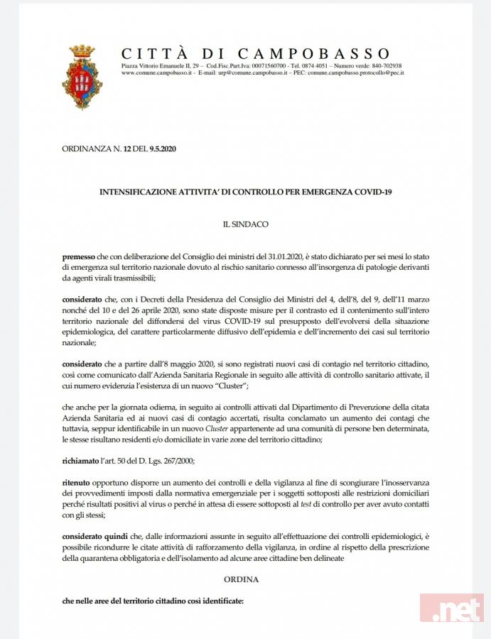 Dopo la conferenza stampa tenuta questa mattina dal sindaco di Campobasso, Roberto Gravina, servita per chiarire ulteriormente la situazione relativa ai contagi accertati negli ultimi due giorni tra la comunità Rom residente a Campobasso, questa sera lo stesso sindaco ha emesso apposita Ordinanza sindacale per l’intensificazione delle attività di controllo in alcune zone cittadine, per l’emergenza Covid-19.