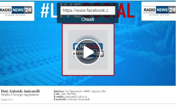 Gabriele Amicarelli, medico chirurgo di Agnone, agopuntorista in una intervista a Radio news 24 #livesocial spiega le origini dell'Agopuntura, e il suo uso e le indicazioni. Il dott Amicarelli pratica l'agopuntura da circa dieci anni, pratica popolare in Paesi importanti come gli Stati Uniti, la Cina, l'Australia, il Regno Unito, la Germania, la Svezia, la Norvegia, la Svizzera e l'Italia.