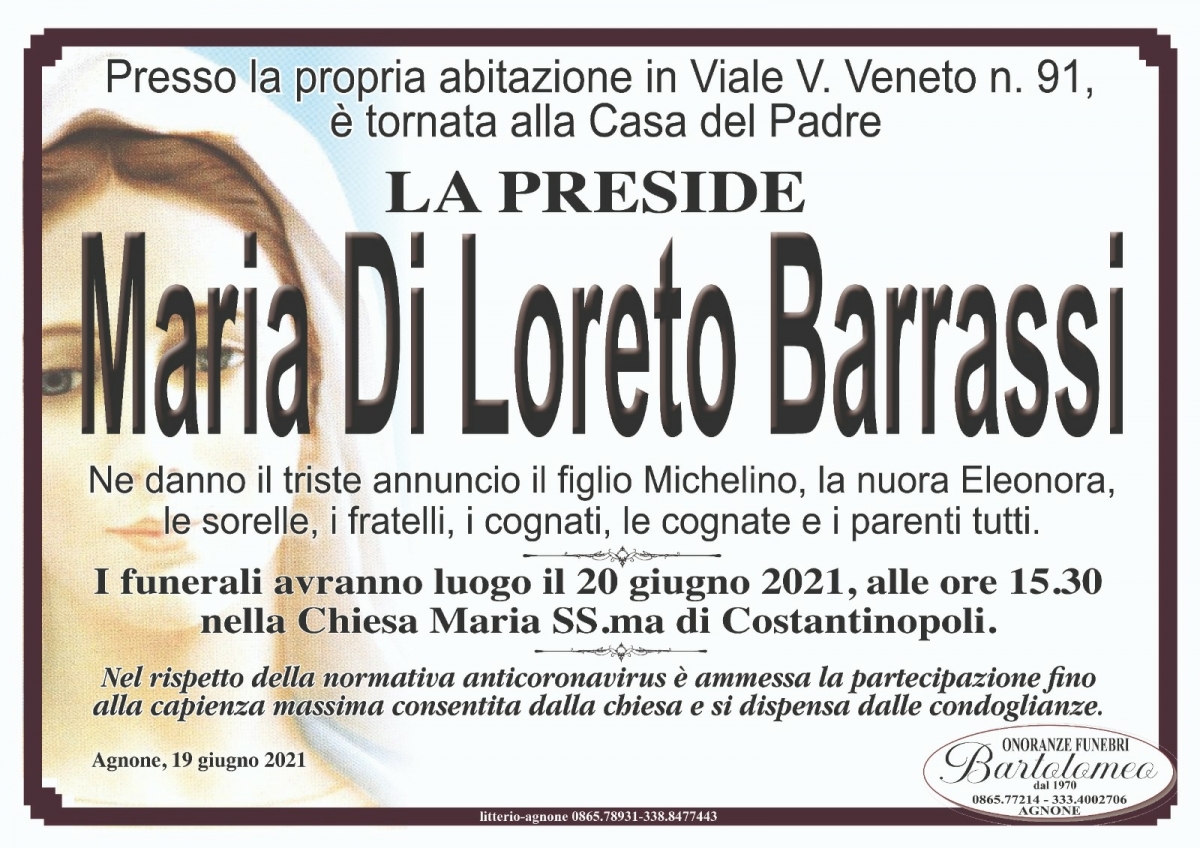 "La Mia preside per eccellenza. Non c'è piu. Non ci sono aggettivi per definirla poliedrica, politico tenace, pedagogo sopraffine, madre premurosa, moglie ineccepibile.Due lauree di cui una in giurisprudenza. Giudice di pace nel finale della sua strepitosa carriera,la dr.sa di Loreto Barrassi è stata un gigante della cultura molisana. Ha cominciato come maestra ed ha terminato come giudice. I miei ricordi più belli li ho vissuti come suo alunno al liceo scientifico di Agnone laddove abbiamo combattuto insieme per l'affermazione della democrazia e mai potrò dimenticare alcuni episodi vissuti con lei che rivelavano tempra e determinazione nel perseguire il bene dei suoi studenti. Carino l'episodio accaduto durante una gita scolastica a Cadenabbia .Con il suo carattere vulcanico irruppe nella discoteca attigua facendo cacciare tutti gli alunni che senza il suo permesso vi erano entrati. Vai verso il tuo paradiso preside, l'urna dei forti ti attende nel tripudio che vive oltre te stessa."