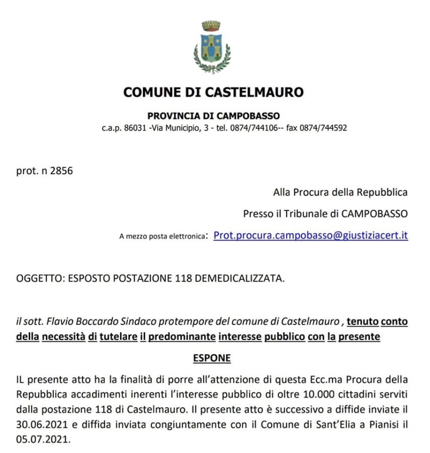 "Lo volevamo evitare ma purtroppo per tutelare gli oltre 10.000 abitanti che usufruiscono della postazione del 118 di Castelmauro oggi unitamente ad alcuni Sindaci abbiamo presentato un esposto alla Procura della Repubblica perché per noi la priorità su tutto e la tutela della salute dei Cittadini che in caso di codice rosso o giallo il cittadino deve essere raggiunto dal mezzo di soccorso entro 18 minuti come da normativa".Queste sono le dichiarazioni del sindaco di Castelmauro, Flavio Boccardo apparse su un post scritto sui social https://www.facebook.com/flavio.boccardo