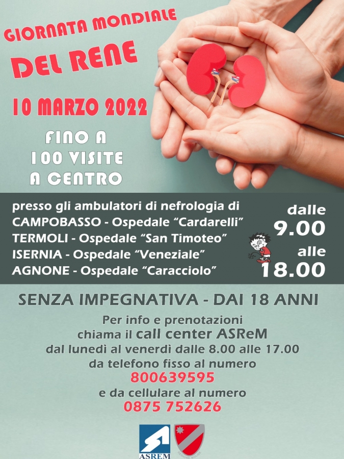In occasione della Giornata Mondiale del Rene, la Regione Molise e l’ASReM hanno inteso aderire all’importante iniziativa organizzando alcune proposte volte alla sensibilizzazione verso le patologie renali.