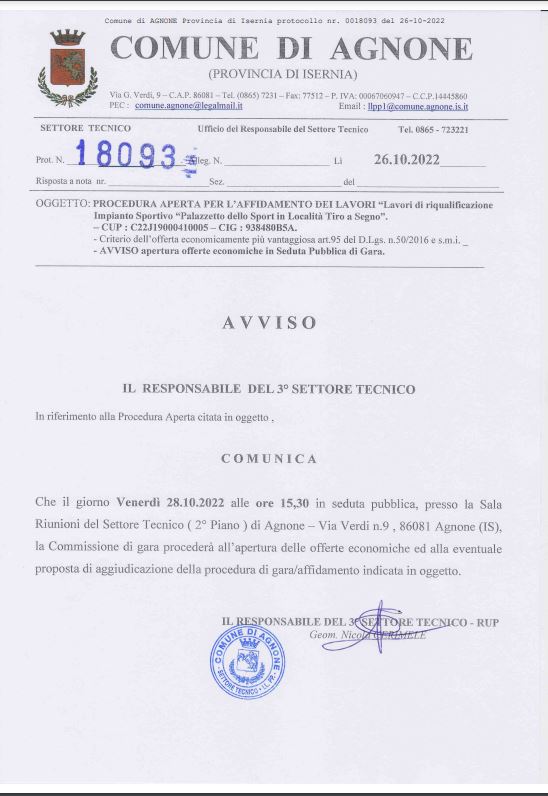 Venerdi 28 ottobre alle ore 15.30 la commissione di gara procederà all'apertura delle offerte economiche relative alla PROCEDURA APERTA PER L'AFFIDAMENTO DEI LAVORI "Lavori di riqualificazione Impianto Sportivo Palazzetto dello Sport in Località Tiro a Segno". ed alla eventuale proposta di aggiudicazione. Questo e' quanto si legge in una nota del responsabile del settore tecnico, Rup, geometra Nicola CERIMELE.
