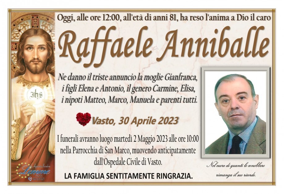 Oggi 1 maggio 2023 è' venuto a mancare all'affetto dei suoi cari Raffaele Anniballe di origine agnonese, ex docente di chimica presso l'Istituto Industriale di Vasto