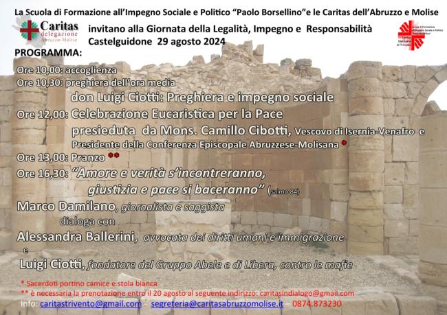 La Scuola di Formazione all’Impegno Sociale e Politico “Paolo Borsellino” e le Caritas dell’Abruzzo e Molise invitano alla 10^ GIORNATA DELLA LEGALITA’, DELL’IMPEGNO E DELLA RESPONSBILITA’ che si svolgerà il 29 agosto p.v. nella Parrocchia S. Maria della Stella in Castelguidone (CH).
