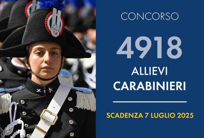 L’Arma dei Carabinieri ha previsto l'assunzione di un numero significativo di giovani che andranno a rafforzare l'organico dell'Istituzione, contribuendo alla sicurezza del territorio e alla tutela della collettività . Sono iniziate le procedure per la selezione e l’arruolamento di 4.918 Allievi Carabinieri in ferma quadriennale del ruolo appuntati e carabinieri dell’Arma. Gli aspiranti potranno presentare, entro il 7 luglio, la domanda online attraverso il sito www.carabinieri.it nell’area concorsi, seguendo l’apposito iter e sostenendo le prove previste dal bando (scritta di selezione, di efficienza fisica, accertamenti psico-fisici per la verifica dell’idoneità psicofisica e attitudinali).