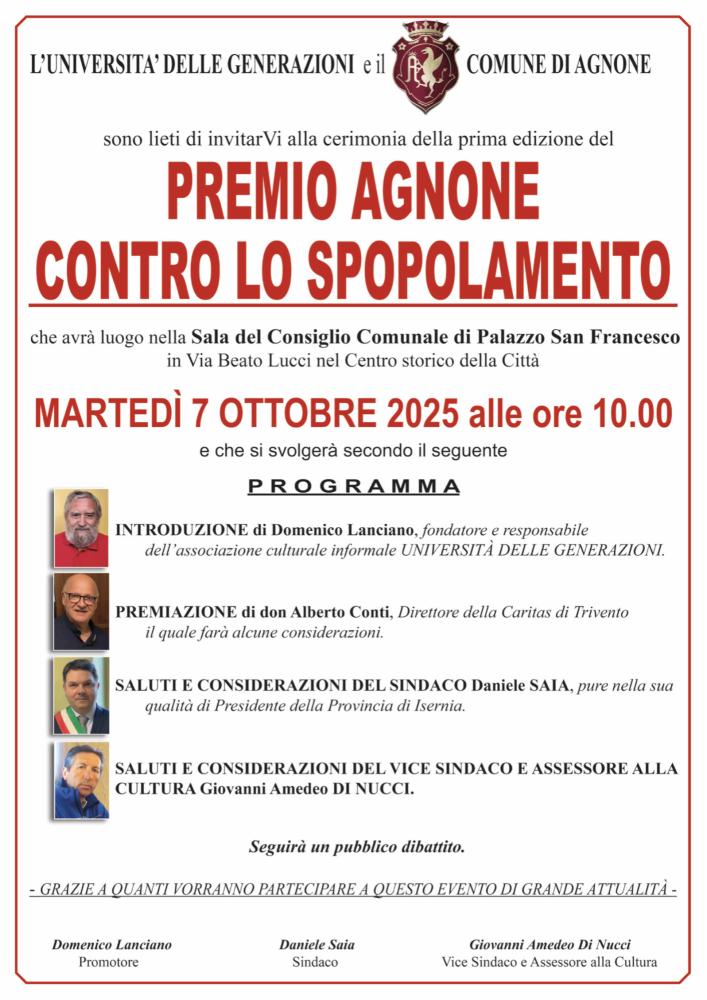 Per dare continuità a questa lotta, l’Università delle Generazioni ha istituito nel giugno 2025 il “Premio Agnone del Molise contro lo spopolamento”, destinato a persone e associazioni impegnate nella salvaguardia delle aree interne e montane. Parallelamente è stato istituito anche il “Premio Badolato di Calabria”, riservato a sindaci e istituzioni che lavorano per rivitalizzare borghi e comunità in abbandono. Per questa prima edizione il “Premio Agnone” va dunque alla Caritas di Trivento e al suo direttore don Alberto Conti, mentre il “Premio Badolato” sarà consegnato al sindaco di Castel del Giudice, Lino Gentile.