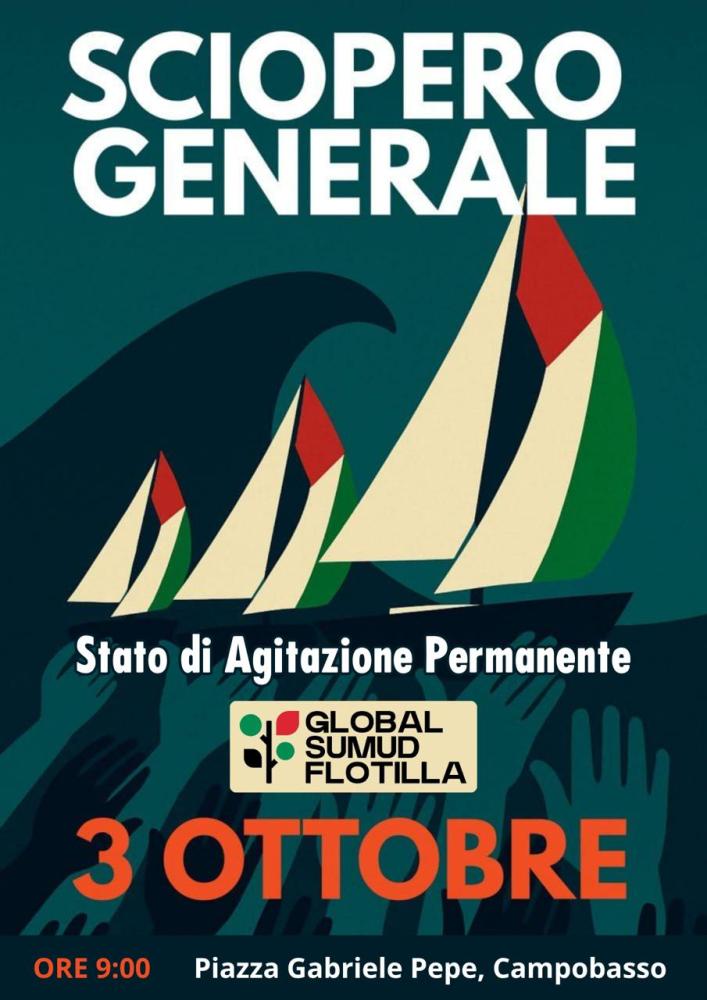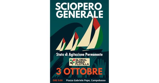 Domani, 3 ottobre, sarà sciopero generale. - in difesa di ciò che ha rappresentato e rappresenta la Flotilla; - per la reazione umana all’ignavia dei governi; - per alimentare la partecipazione e la volontà di non rassegnarsi alla violenza che impunita sta annientando un popolo; - per l’affermazione dei diritti (costituzionali, umani, universali….), di chi subisce ingiustizie, di chi si mobilita contro di esse; - per il bisogno di opporsi con fermezza e determinazione a chi sta calpestando leggi e convenzioni violando il diritto internazionale e per affermare il diritto fondamentale di umanità; -affinché l’Italia interrompa ogni collaborazione militare ed economica con lo Stato di Israele, sospendendo gli accordi industriali e fermare l’economia di guerra. DOMANI SARA’ SCIOPERO GENERALE PERCHE’ SIAMO CONTRO GLI OPPRESSORI E AL FIANCO DEGLI OPPRESSI. In Molise ci sarà una grande manifestazione a Campobasso che partirà da Piazza Pepe alle ore 9 (davanti alla Prefettura) e si muoverà verso Piazza Municipio attraversando viale Elena. La CGIL del Molise, l’USB e il grande movimento dal basso 0409 (4 settembre) che si è costituito spontaneamente a Campobasso grazie alla mobilitazione di studenti e di gruppi spontanei della società civile invitano lavoratrici, lavoratori, Partiti politici , associazioni laiche e cattoliche, liberi cittadini e libere cittadine ad aderire allo sciopero e a partecipare alla manifestazione.