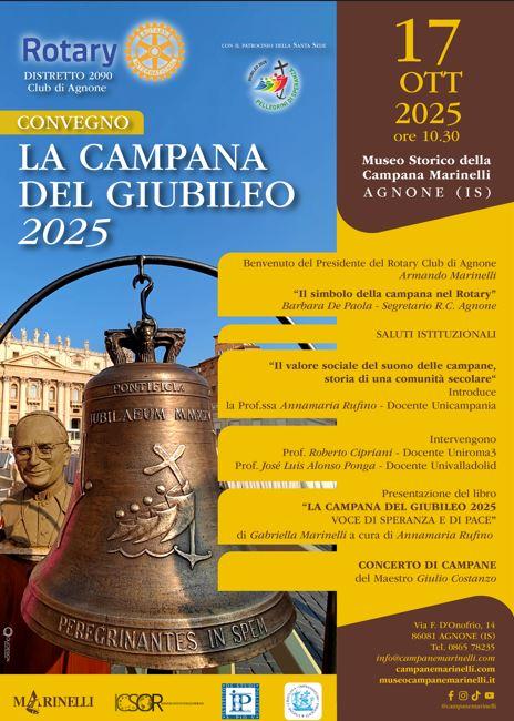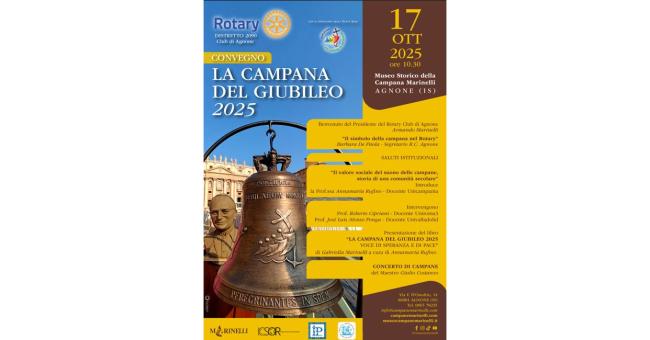 Organizzato dal ROTARY CLUB di Agnone e patrocinato dalla Santa Sede, l'evento si terrà il 17 Ottobre 2025 alle ore 10,30 presso il Museo Storico della Campana Marinelli, con il Presidente Armando Marinelli e il Segretario Barbara De Paola che spiegheranno il ruolo della campana nel Rotary.
