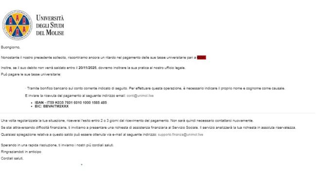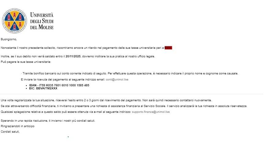 L’Università degli Studi del Molise ha informato la comunità studentesca della circolazione di una e-mail che, pur apparendo a un primo sguardo riconducibile a un indirizzo istituzionale, non proviene dall’Ateneo. Il messaggio ha come oggetto “Pagamento in sospeso della quota di iscrizione” e invita il destinatario a versare presunte tasse universitarie, indicando importi, scadenze e un IBAN esterno ai canali ufficiali.
