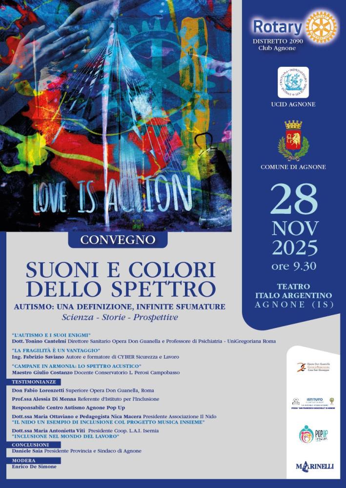 AGNONE (IS) – La città di Agnone si prepara a ospitare un importante evento dedicato all'approfondimento e alla sensibilizzazione sul tema dell'autismo. Il convegno "SUONI E COLORI DELLO SPETTRO", promosso dal Rotary Club Agnone in collaborazione con il Comune di Agnone e l'UCID Agnone, si terrà il prossimo venerdì 28 novembre 2025.