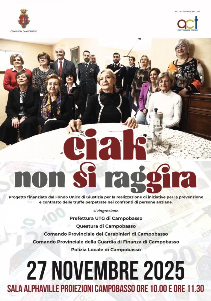 Si terrà giovedì 27 novembre 2025, alle ore 10:00, presso la Sala Alphaville in Via Muricchio, l’evento conclusivo del progetto “Ciak: non si raggira”, promosso dal Comune di Campobasso.