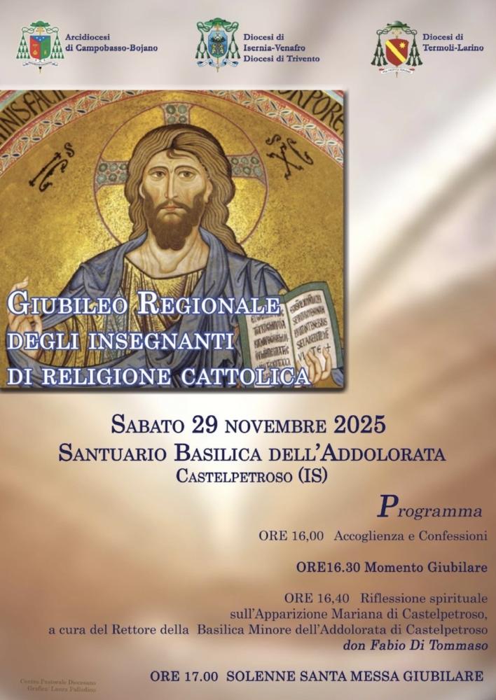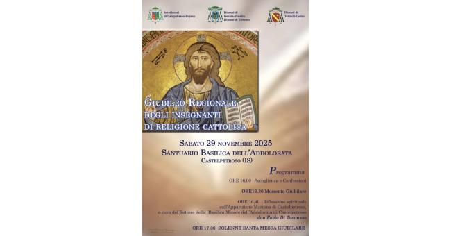 Sabato 29 novembre Castelpetroso ospiterà il Giubileo regionale degli insegnanti di religione cattolica, un evento che vedrà riunite le quattro circoscrizioni ecclesiastiche molisane: l’Arcidiocesi di Campobasso-Bojano e le diocesi di Isernia-Venafro, Trivento e Termoli-Larino. La Basilica Minore dell’Addolorata, cuore della devozione mariana della regione, sarà la cornice di questo significativo momento di spiritualità e riflessione.