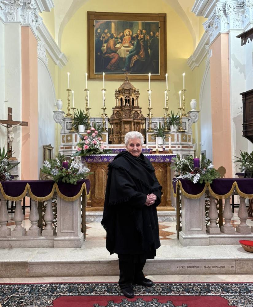Ha saputo far fronte in maniera mirabile all’educazione e alla crescita dei figli e dei nipoti, tutti amati di un amore intimo e rassicurante. I nipoti ricordano come dopo le loro marachelle da bambini ricorrevano a lei che li metteva al riparo dai rimproveridei genitori. Assistita da buona salute, lucidissima, autonoma, una memoria di ferro. Vive da sola la sua quotidianità, prendendosi cura di se, ogni mattina accende il fuoco, cucina, rassetta la casa, guarda la tv,ogni tanto una telefonata e soprattutto recita le sue adorate preghiere. Un percorso esistenziale specchiato e vissuto da profonda credente. Un’immagine prevale sulle altre e la vede affacciata al balcone di casa, dall’alto del suo secolo di storia, asalutare, come sempre, il passaggio della Madonna delle Grazie in processione, con una cascata di petali di rosa, raccolti e selezionati con sentimenti autentici di assoluta e commovente devozione.