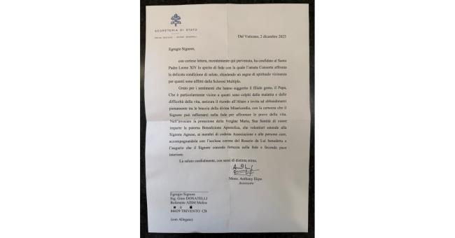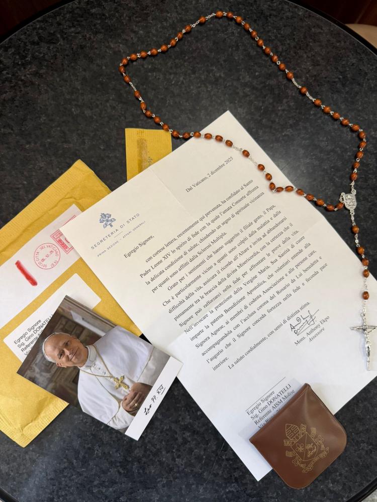 La risposta del Vaticano, datata 2 dicembre 2025 e firmata da Mons. Anthony Ekpo, nuovo Assessore per gli Affari Generali della Segreteria di Stato, è giunta nelle mani di Donatelli il 2 gennaio. Nella lettera si esprime la particolare vicinanza del Papa a quanti sono colpiti dalla malattia e dalle difficoltà della vita, assicurando il ricordo all’Altare e invitando ad affidarsi alla divina Misericordia per trovare la forza di affrontare le prove dell’esistenza. Non solo parole. Il Santo Padre ha infatti impartito la Benedizione Apostolica, estendendola alla signora Agnese, ai membri dell’AISM e alle persone care, accompagnandola con una corona del Rosario benedetta, come segno concreto di conforto, pace interiore e sostegno spirituale.