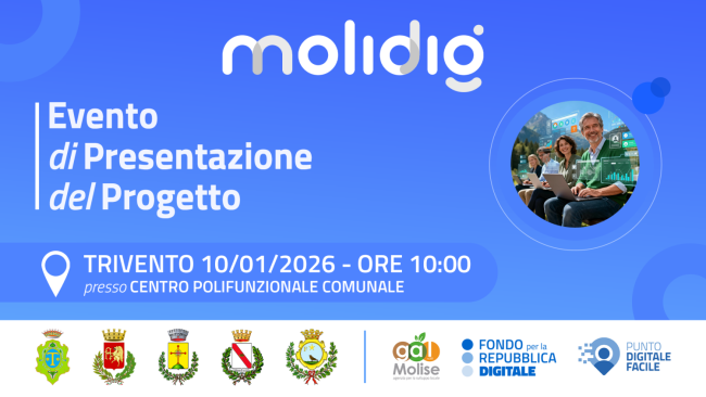 Sabato 10 gennaio 2026, alle ore 10, presso il centro polifunzionale comunale di Trivento, si terrà l’evento di presentazione del progetto “MOLIDIG – Molise Digitale”, un’ambiziosa iniziativa volta a promuovere la crescita socio-economica del territorio molisano attraverso l’alfabetizzazione digitale e l’innovazione.