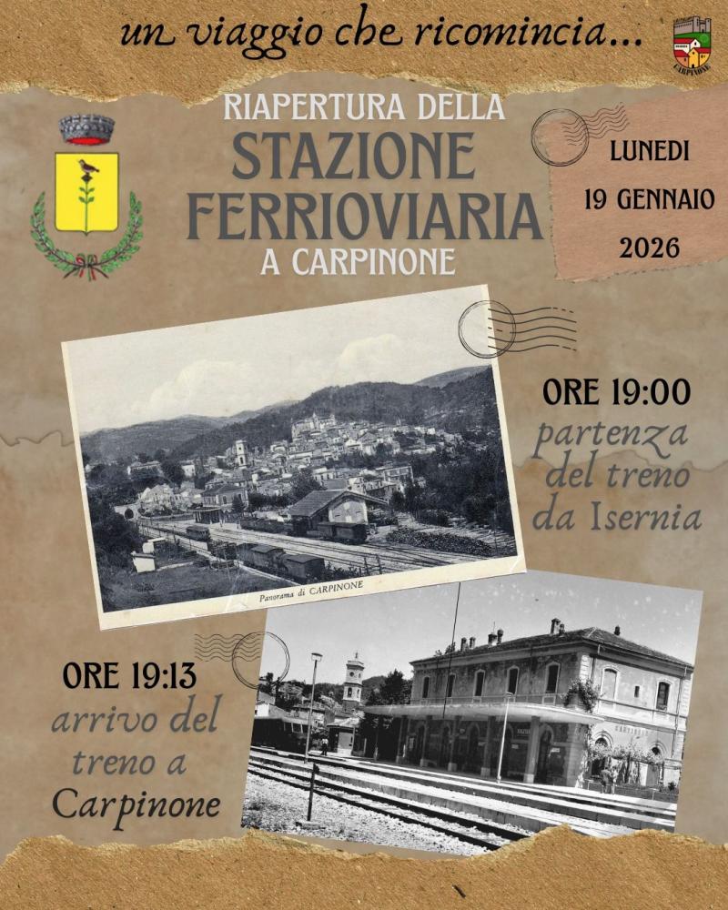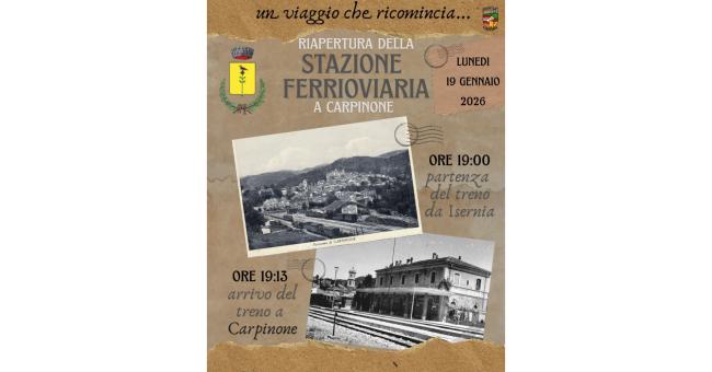 Lunedì 19 gennaio alle ore 19 e 13 minuti i cittadini, gli amministratori, la Nuova Pro Loco Carpinone, il Gruppo Folk "Ru Maccature", l' ASD Carpinone Calcio, la Fanfara degli Alpini di Sant'Agapito e il Parroco riserveranno al convoglio la meritata accoglienza. L'appuntamento è alle ore 18.30 presso il piazzale antistante la stazione. IL SINDACO Avv. Pasquale Colitti fai titolo