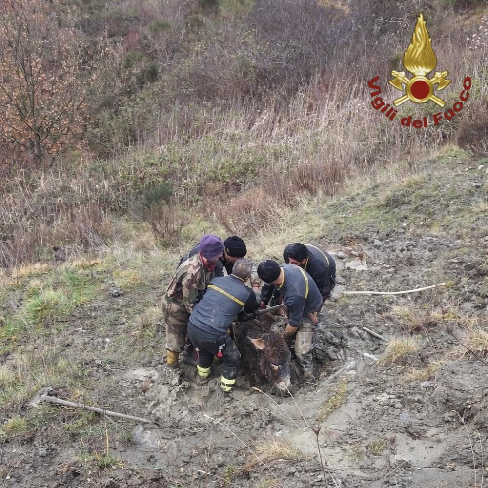 Gli animali, pur essendo vivi, erano esausti e incapaci di muoversi autonomamente a causa del fango e della natura impervia del terreno. Grazie all’impiego di attrezzature speciali e alle tecniche SAF (Speleo-Alpino-Fluviali), i Vigili del Fuoco sono riusciti a liberarli e a trasferirli in una zona pianeggiante e sicura.