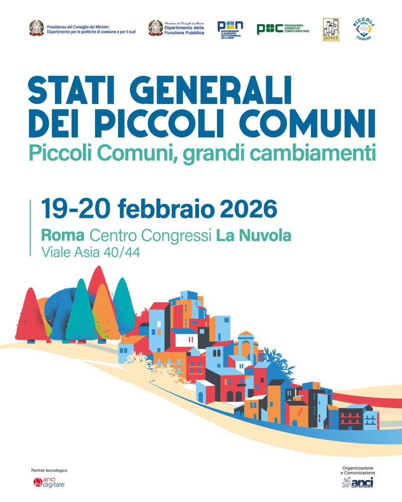 ROMA, 12 FEB – Si svolgeranno giovedì 19 e venerdì 20 febbraio 2026, a Roma, presso il Roma Convention Center “La Nuvola” (EUR), gli Stati generali dei Piccoli Comuni, appuntamento nazionale organizzato in occasione dell’evento conclusivo di P.I.C.C.O.L.I., il progetto promosso dal Dipartimento della Funzione pubblica nell’ambito del Programma operativo complementare (POC) al PON “Governance e Capacità Istituzionale” 2014-2020 e attuato da ANCI.