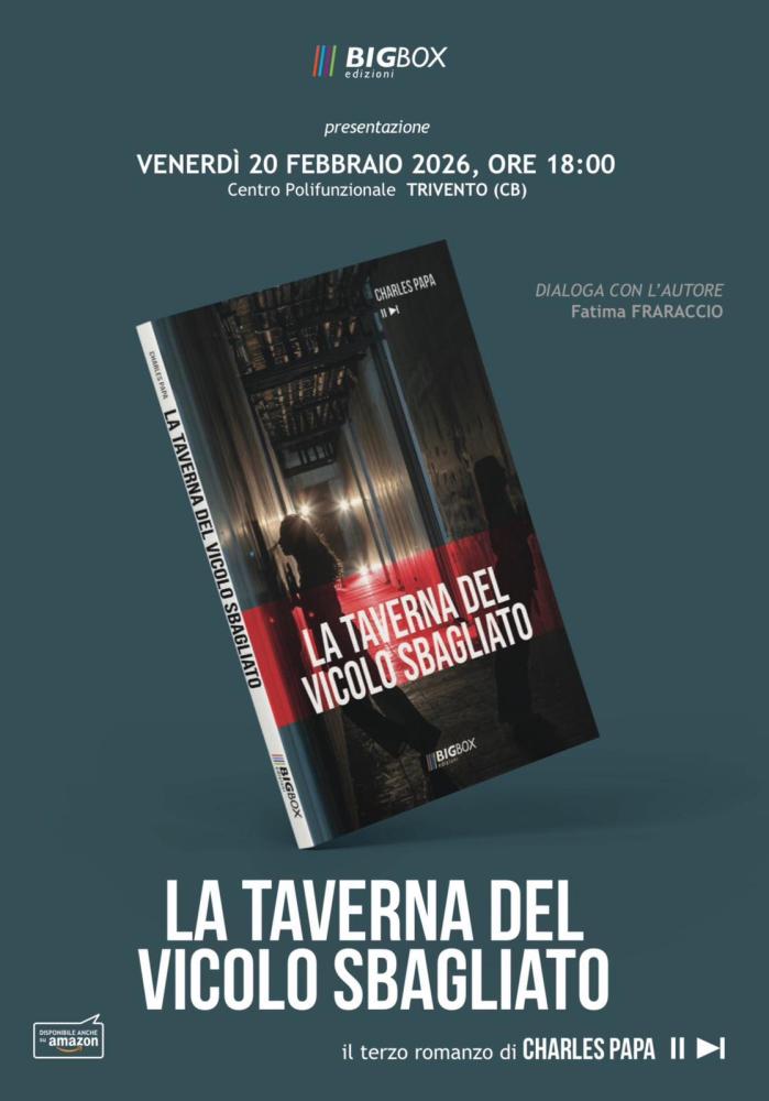Ieri sera, 20 febbraio, presso il centro polifunzionale di Trivento, la Pro Loco Terventum ha ospitato la presentazione del nuovo romanzo di Charles Papa, La taverna del vicolo sbagliato, pubblicato dalla casa editrice molisana BigBox, diretta dal triventino Mario Scatolone.