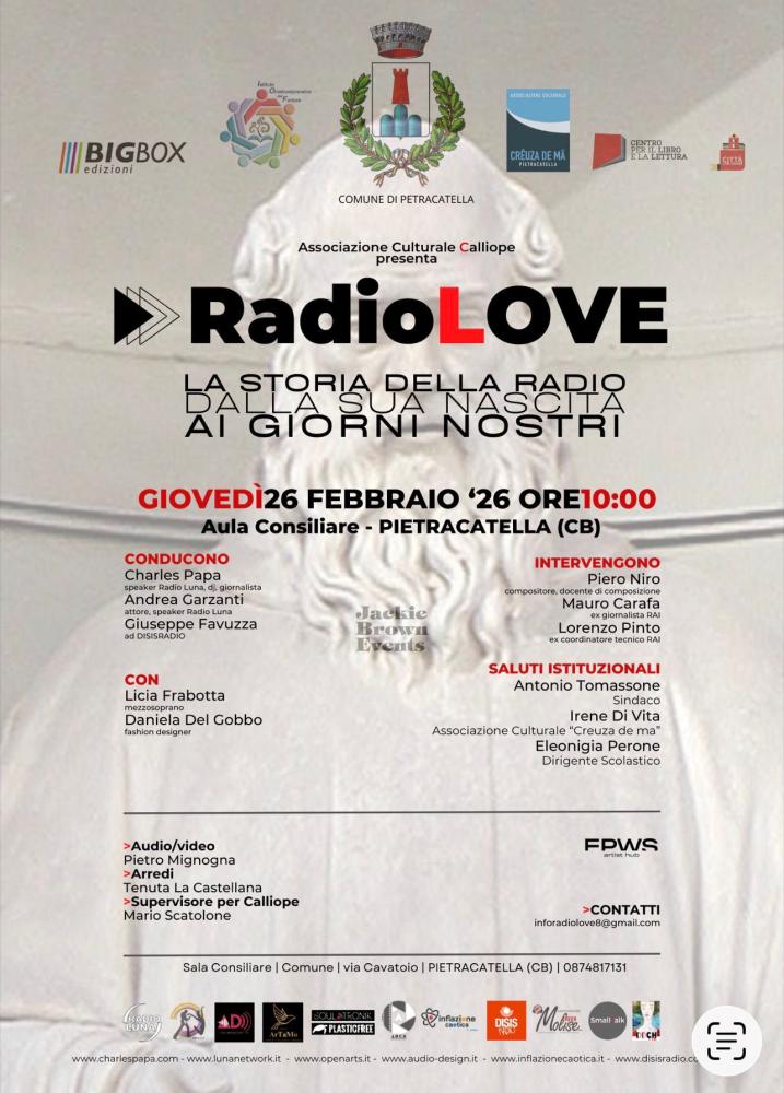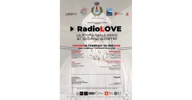 Sarà l’aula consiliare del Comune di Pietracatella ad ospitare RadioLove, giovedì 26 febbraio alle ore 10, lo show che racconta la storia della radio dalla nascita ai giorni nostri e che simula una trasmissione con speaker, dj, ospiti e collegamenti video.