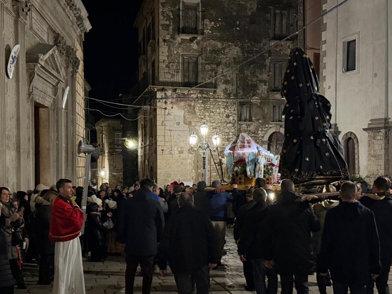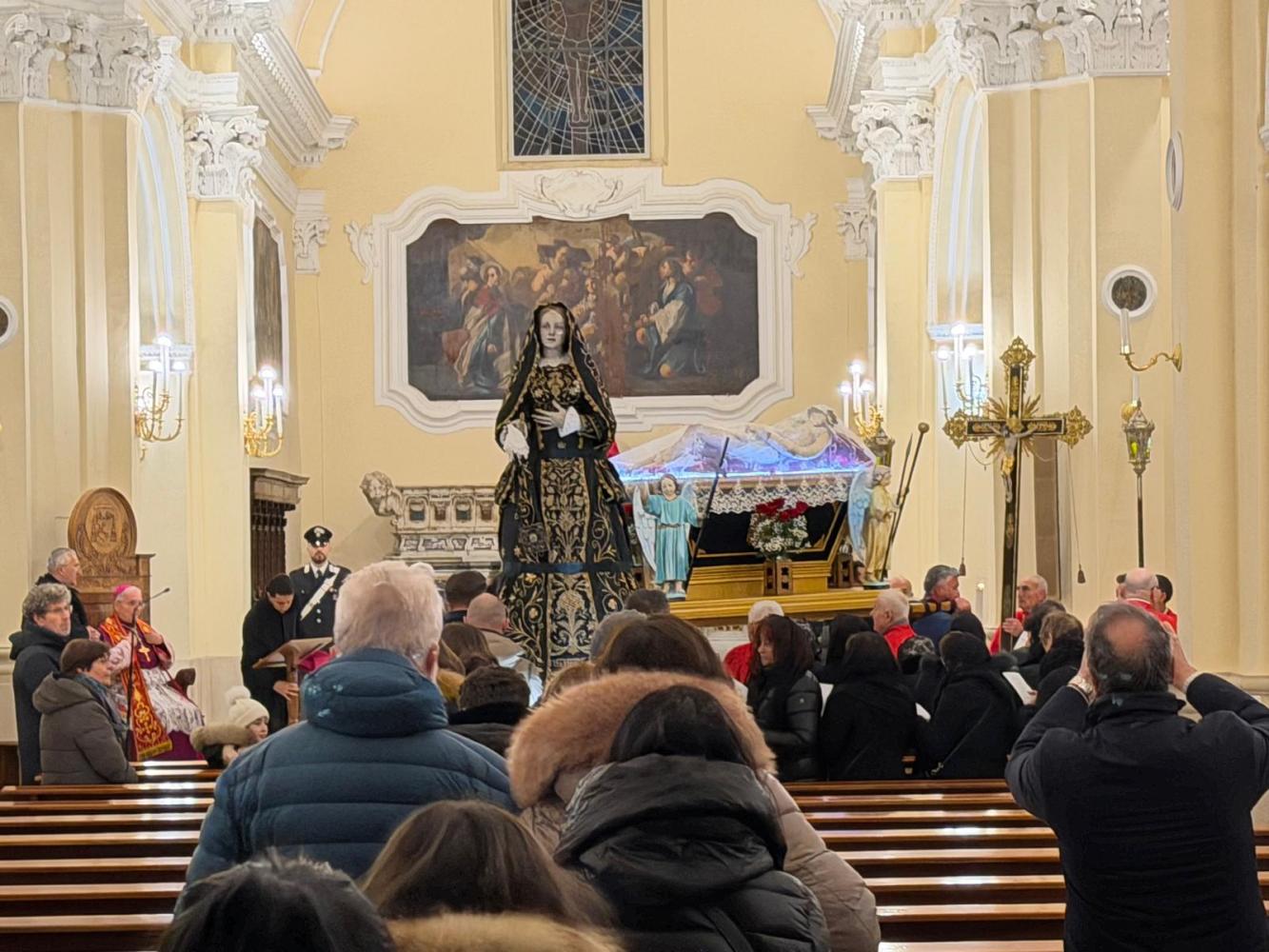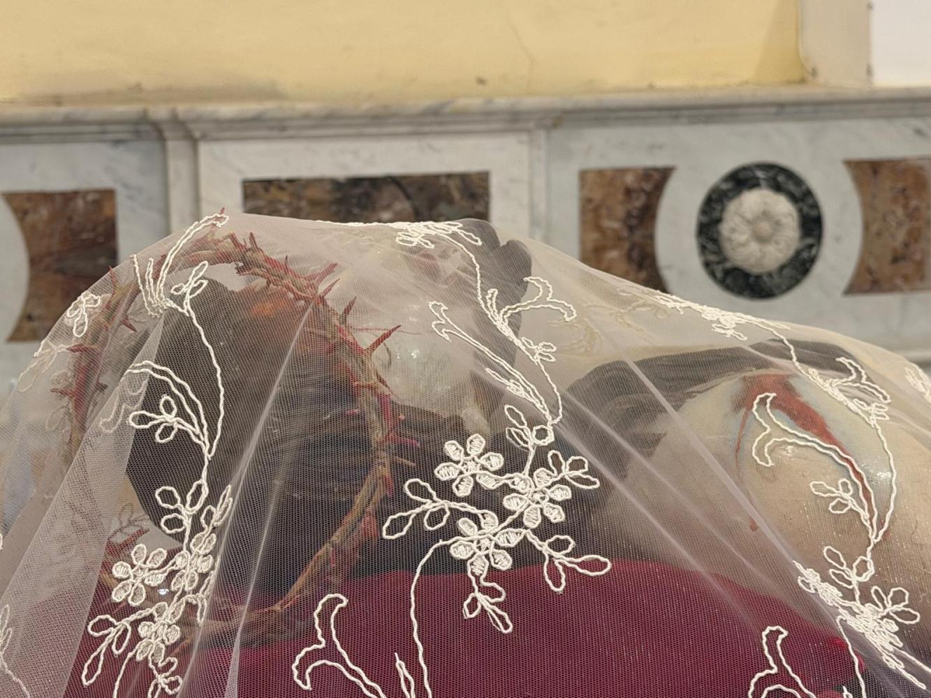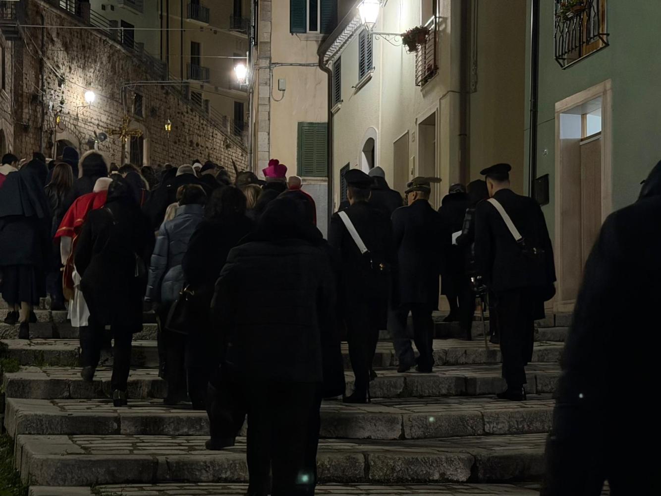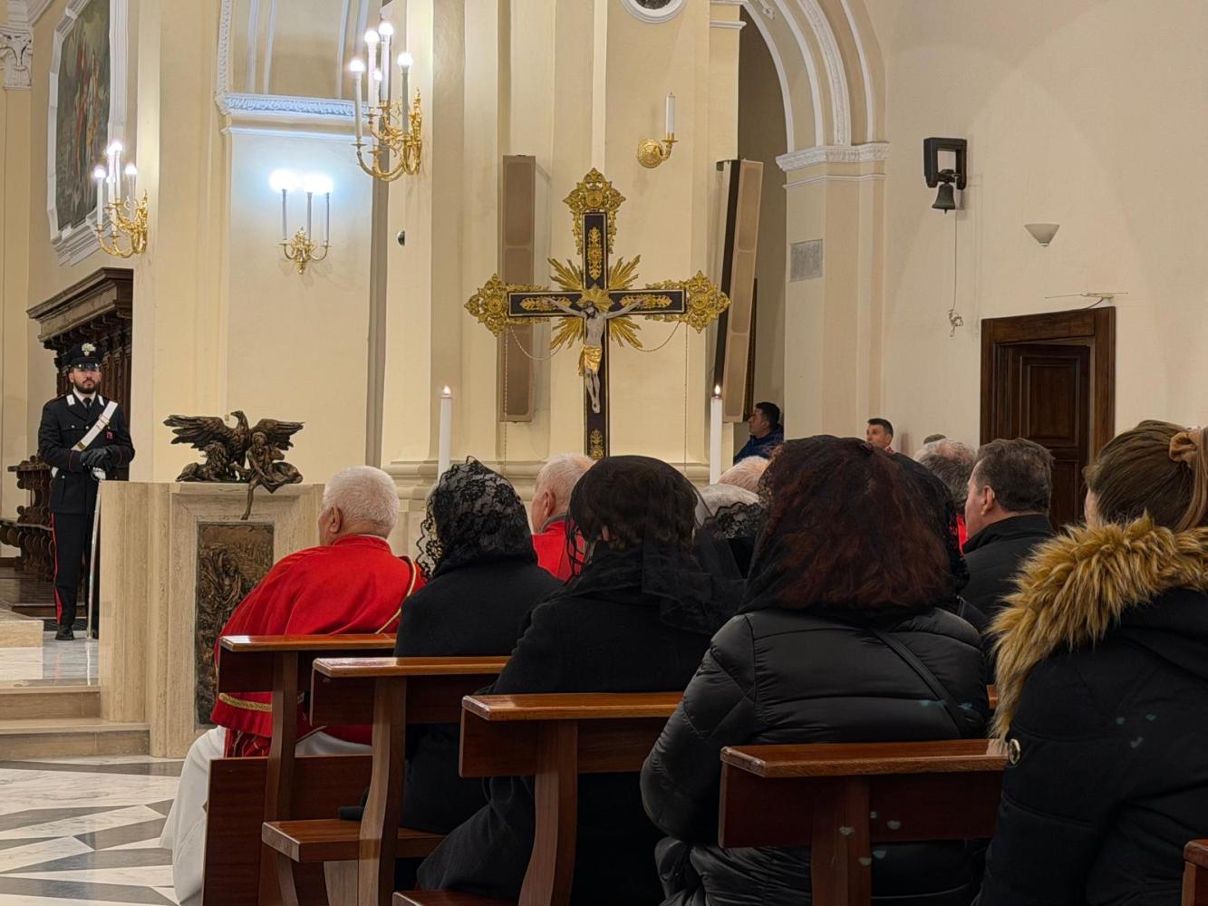 Il corteo ha attraversato le vie del paese, seguito da fedeli. Tra i partecipanti anche le Sorelle dell’Addolorata: donne vestite di nero con il capo coperto da un velo, tra le figure più caratteristiche della processione. Al rientro in Cattedrale si è svolto uno dei momenti più intensi: i fedeli, uno alla volta, si sono inginocchiati davanti alla reliquia della Santa Spina, sostando in preghiera.