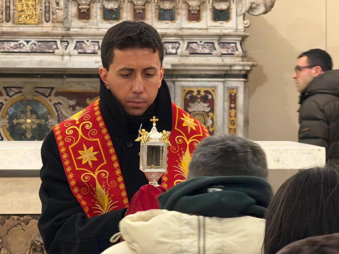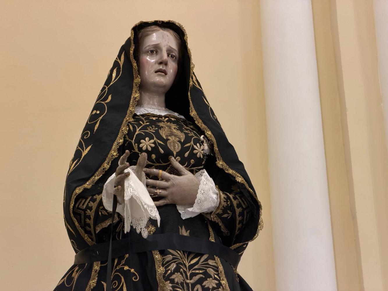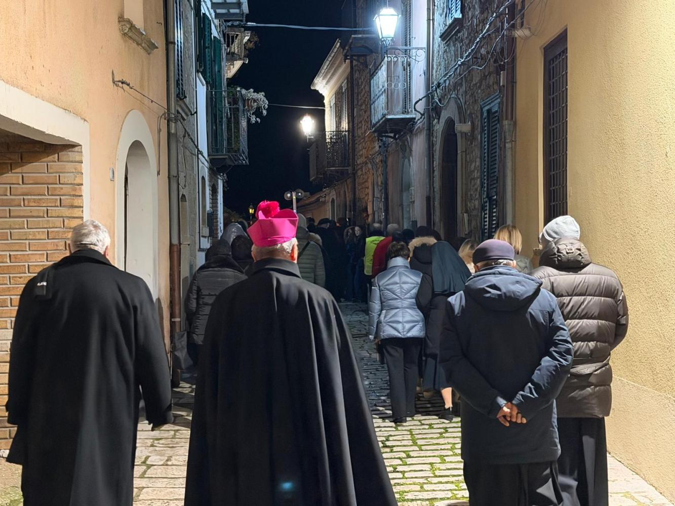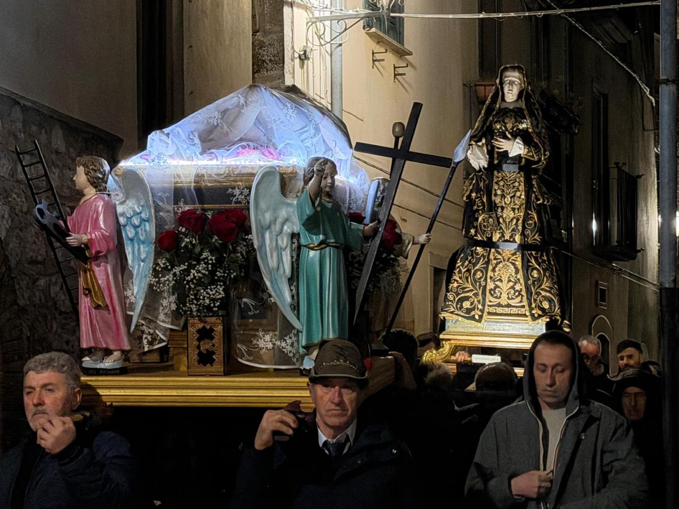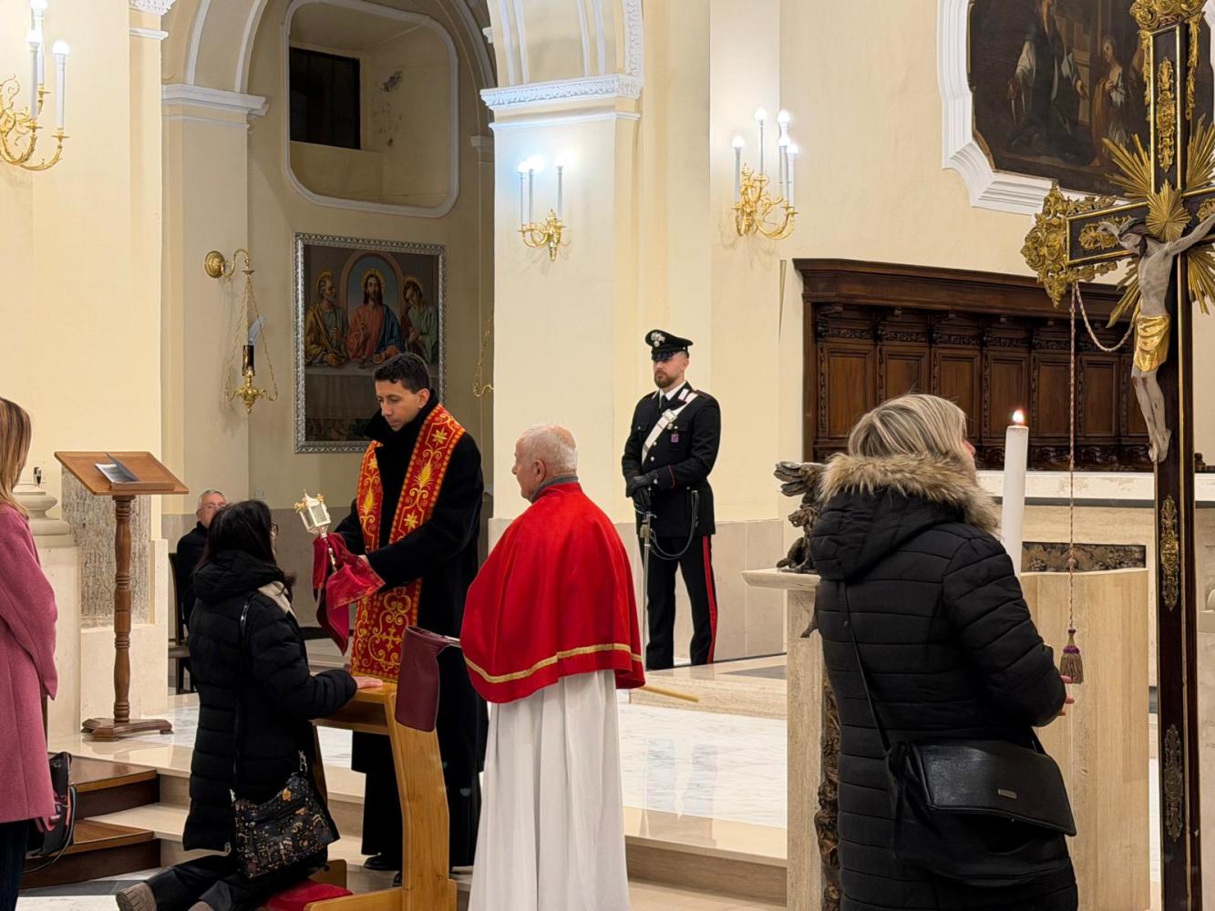 Il corteo ha attraversato le vie del paese, seguito da fedeli. Tra i partecipanti anche le Sorelle dell’Addolorata: donne vestite di nero con il capo coperto da un velo, tra le figure più caratteristiche della processione. Al rientro in Cattedrale si è svolto uno dei momenti più intensi: i fedeli, uno alla volta, si sono inginocchiati davanti alla reliquia della Santa Spina, sostando in preghiera.