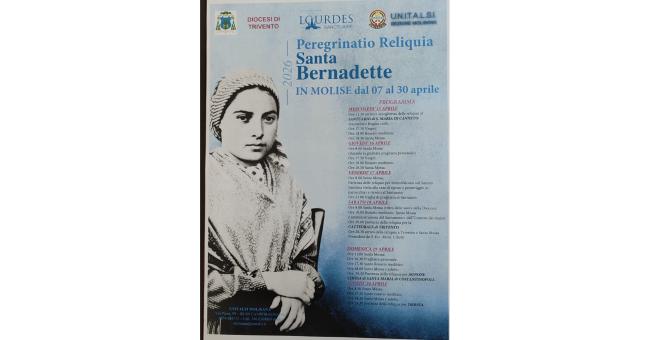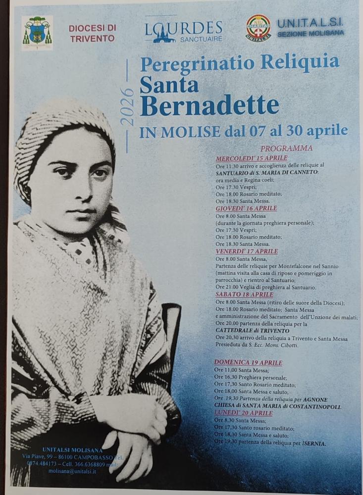 La diocesi trignina si prepara ad accogliere un evento di grande significato spirituale: la Peregrinatio delle reliquie di Santa Bernadette Soubirous, provenienti dal Santuario di Lourdes, in Molise dal 7 al 30 aprile. Un’iniziativa che coinvolge l’intero territorio diocesano e vede le comunità riunite in preghiera.