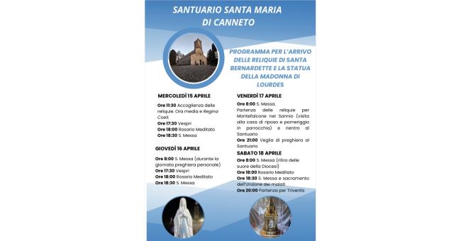 Tra le tappe previste, particolare rilievo assume quella presso il Santuario di Santa Maria di Canneto (Roccavivara), dove le reliquie giungeranno mercoledì 15 aprile alle ore 11:30. L’accoglienza sarà accompagnata dall’Ora media e dalla preghiera del Regina Coeli. Nel pomeriggio sono previsti i Vespri, il Rosario meditato e la celebrazione della Santa Messa.