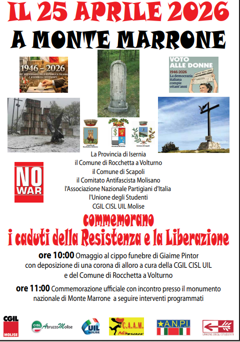 • 25 Aprile Monte Marrone ore 10.00 COMMEMORAZIONE DEI CADUTI DELLA RESISTENZA E DELLA LIBERAZIONE;(in collaborazione con CISL,UIL,ANPI,UDS. C.A.A.M.)
