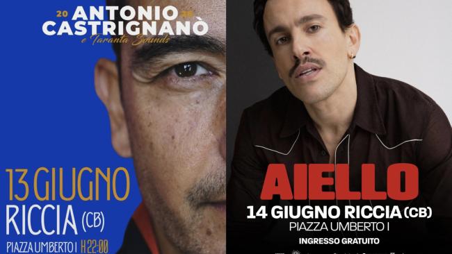 Due grandi live per la festa di Sant’Antonio a Riccia. Si comincia sabato 13 giugno con Antonio Castrignanò e si prosegue domenica 14 con Aiello. Entrambi i concerti si terranno in piazza Umberto I con ingresso gratuito.