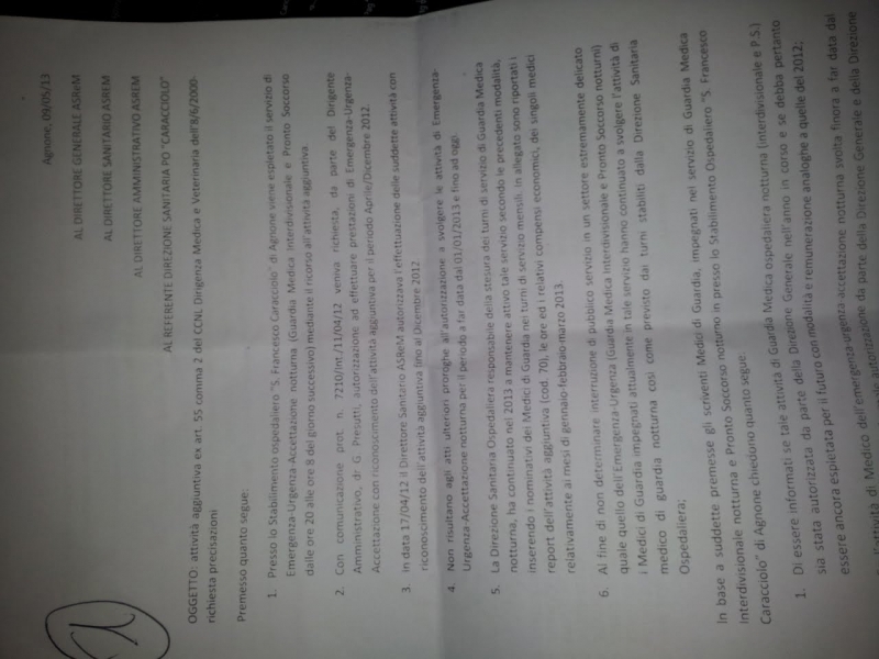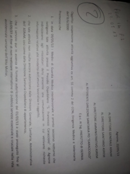 AGNONE. L’ospedale Caracciolo come una vera e propria polveriera. Sei medici (Piero Pescetelli, Pompeo Petrella, Antonio Cerimele, Armando Falasca, Daniele Cerimele e Giuseppe Attademo, ndr) denunciano: “Da cinque mesi facciamo le guardie notturne senza autorizzazione e soldi”. In una missiva (la seconda inviata nell’arco di un mese) inviata al direttore generale, al direttore sanitario e amministrativo dell’Asrem, al referente della direzione sanitaria del Caracciolo, nonché al prefetto di Isernia, i camici bianchi che svolgono l’attività nelle ore notturne, scrivono: “Dal primo gennaio 2013 il servizio non risulta ancora essere autorizzato dalla direzione generale e amministrativa dell’Asrem, così come dalla direzione sanitaria ospedaliera di appartenenza. Pur in assenza di formale autorizzazione formale - si legge nel documento – proseguiremo la nostra attività fino al 31 maggio al fine di non realizzare l’interruzione di pubblico servizio essenziale e cruciale nella rete assistenziale sanitaria dell’Alto Molise”. Tuttavia, minacciano i medici: “Se entro la fine del mese di maggio non riceveremo chiarimenti in materia saremo costretti ad interrompere le nostre prestazioni che oggi, inutile rimarcarlo, garantiscono l’emergenza-urgenza h 24 nella struttura sanitaria di frontiera”. Oltre a ciò, i firmatari della lettera sottolineano come “durante le ore notturne capita spesso di non poterci avvalere delle consulenze pediatriche, radiologiche e ortopediche”. Una situazione, quest’ultima, che ormai si protrae da svariati mesi. Infatti nelle ore notturne il servizio di Radiologia funziona solo 15 giorni al mese, il pediatra copre appena dieci giorni al mese, mentre l’ortopedico è chiamato a coprire i turni al Veneziale di Isernia. A tutto ciò va aggiunto che ormai al Caracciolo di Agnone non esiste più una figura dirigenziale che possa fare da tramite con Campobasso per ciò che concerne le problematiche della struttura altomolisana. A conferma di ciò il mancato prolungamento del contratto a Giovanni Presutti a partire dal primo gennaio del 2013.