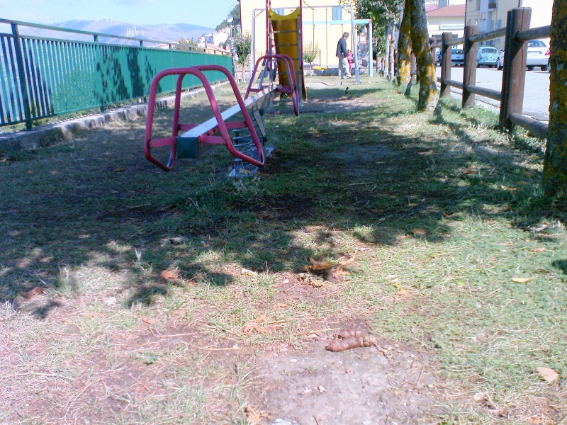 SCHIAVI DI ABRUZZO - Il parco giochi di Schiavi di Abruzzo utilizzato da cani più o meno incustoditi per espletare i propri bisogni fisiologici. E mentre i bimbi giocano, magari calpestano accidentalmente una bella cacca di cane appena depositata, ancora fumante.