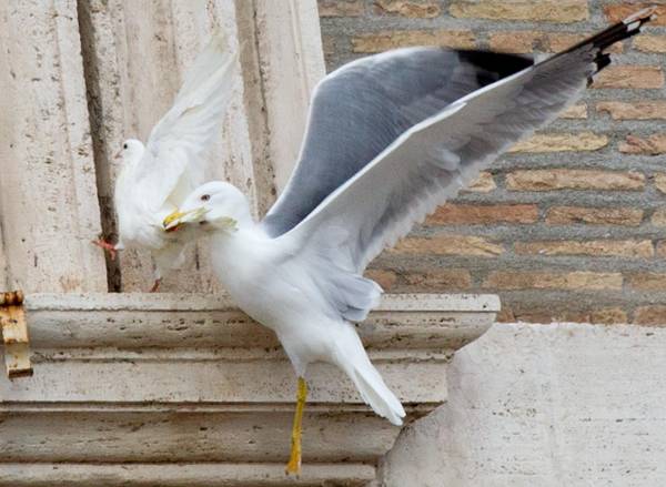 Tragico inconveniente per una colomba, simbolo della pace, liberata ieri alla finestra da Papa Francesco dopo il tradizionale Angelus. Un gabbiano l'ha attaccata e l'ha portata via. Un segno profetico? Semplicemente un episodio naturale, l'eterna lotta tra predatore e preda.