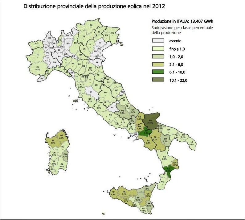 Traducendo questi numeri in percentuale ci si accorge che, così facendo, il Molise ottiene, dal vento, ben il 5,3% del proprio fabbisogno elettrico mentre l'Abruzzo solo il 2,5 (figura1). Ovviamente questo dipende da due fattori principali: la grandezza della regione e il numero, non trascurabile, di impianti montati. Affondando le 'unghie' nella carne di questi dati si può apprezzare anche la produzione di questa energia pulita anche provincia per provincia. Si nota infatti che il dato riguardante Campobasso e la sua 'giurisdizione' è quello più alto nell'area che stiamo analizzando: 3,9% di energia totale prodotta. Immaginando una classifica di produttività troveremmo, sul secondo gradino del podio, la provincia di Isernia attestata su un valore di 1,5%. Chiude il podio Chieti che totalizza l'1,4% della produzione regionale di energia eolica. Medaglia di legno e ultima della classifica infine per la provincia de L'Aquila che fa registrare l'1,0% della produzione regionale (figura2). Tuttavia un dato importante è che ci sono perdite trascurabili di energia dal luogo prodotto a quello in cui se ne usufruisce, pertanto l'efficienza dei diversi impianti è quasi massima.