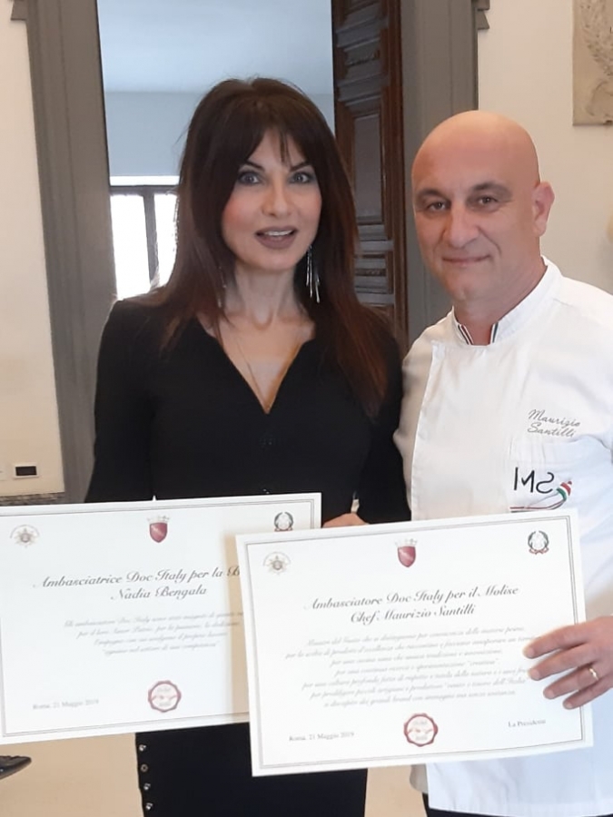 Il 21 maggio 2019 presso le sale del Campidoglio a Roma è avvenuta l’investitura istituzionale degli Ambasciatori Italiani per le eccellenze delle professioni, un vero e proprio premio alla carriera. A Rappresentare il Molise per l’Italia  il Prof. Maurizio Santilli, docente di enogastronomia presso l’istituto Alberghiero “Federico di Svevia” di Termoli, a conferma della prima investitura avuta del 2017. Oggi riconfermato Ambasciatore Italiano dalla DOC Italy eccellenze per l’Italia per il Molise. La citazione dell’investitura riguarda i grandi professionisti nei vari campi professionali ed il Prof. Santilli è stato investito di questa onorificenza riguardante l’enogastronomia nei percorsi del Gusto e del Turismo Enogastronomico di eccellenza: Per Amor Patrio, per la Passione, la Dedizione, l’Impegno con cui svolge il proprio Lavoro, nel Diffondere Cultura, Tradizioni, Sapori & Saperi del proprio Territorio, nella Missione che svolge quotidianamente nel promuovere la Cultura Enogastronomica e Turistica del Molise in Italia e all’estero. Le sue parole sono state espressamente rivolte ai produttori dedicando loro l’investitura: “Dedico questa mia riconferma d’Investitura  ai produttori e ai Maestri del gusto che quotidianamente e con grande Maestria costruiscono l’identità di Gusto della nostra Regione, non c’è missione che tenga se ciò che si realizza e si costruisce non lo si fa con passione e dedizione è questa è la base da cui creare l’identità di un Territorio attraverso la cultura ed il Sapere”. Ancora una volta il Molise viene portato alle vette Nazionali grazie all’impegno di grandi professionisti che dedicano il loro lavoro alla qualità certificando il bello ed il buono che la nostra regione ha e che fa sopravvivere con grande umiltà e attenzione. Il prof Santilli ha abbinato in modo singolare la sua investitura con quella della Ex Miss Italia Nadia Bengala, creando un binomio “Ambasciatori del Gusto e della Bellezza.”