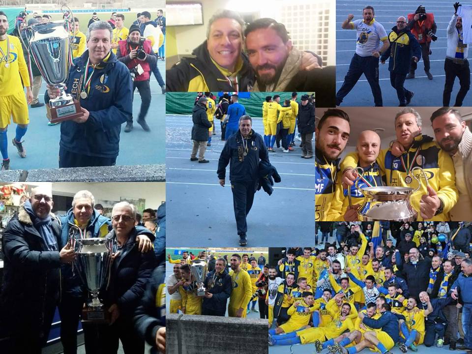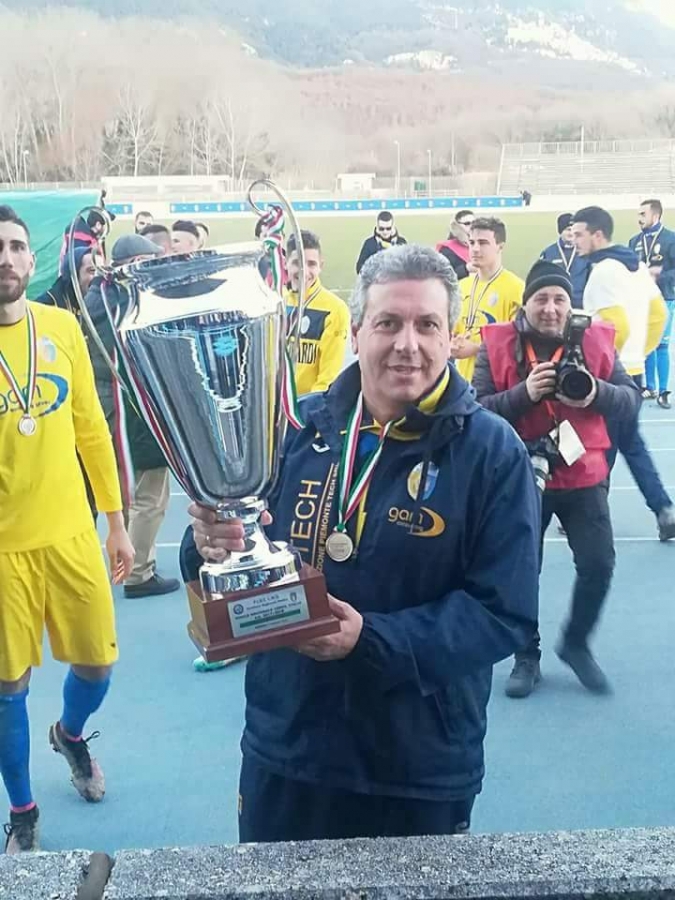 Lo abbiamo visto su molti giornali felice e sorridente innalzare  al cielo la Coppa Italia Regionale dopo che la squadra che allena oramai da due anni, ha battuto nella finale,in una gara difficile ITre Pini Matese.